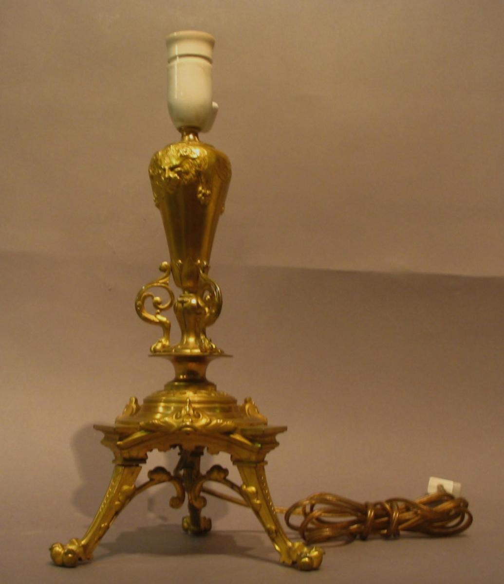 Fransk bronzelampe. lueforgyldt, 19. årh.. Med fødder i form af løvefødder; mellemstykke med havuhyrer; stamme og midterstykke med løvefødder. Top med dekoration i form af liggende løveskind. Omgjort til el. H.: 41 cm.