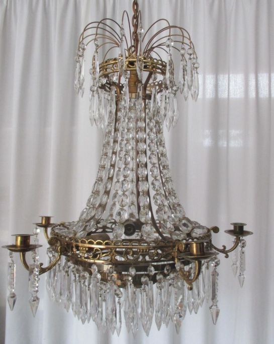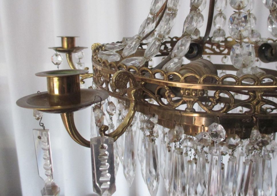 Svensk lysekrone med prismer, 20. årh. Messing /bronze monteret. Med 4 lysarme til stearin lys; indvendig med 6 pærer til el. Med 388 prismer. Højde.: 60 cm. Dia.: 45 cm.