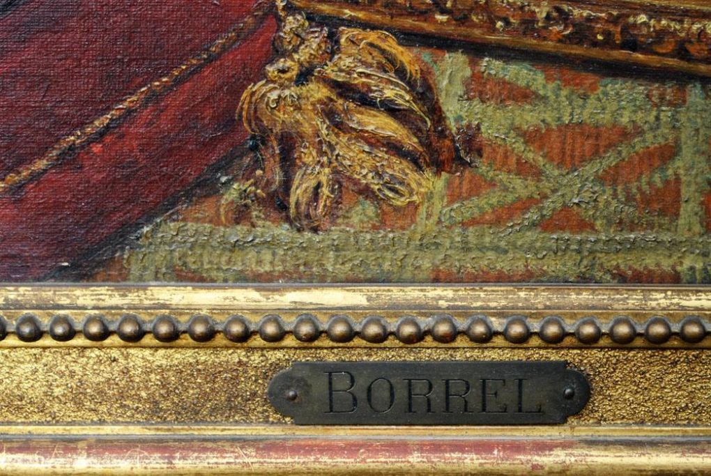 Borrel, Anna Rimbault (19. årh.) Historisk scene med tre personer. Olie på lærred. 82 x 112 cm.