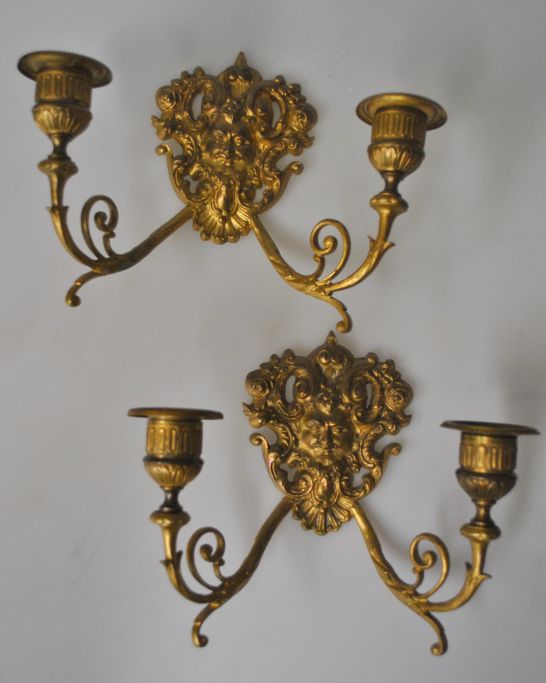Par franske lue forgyldte vægstager, 19. årh. Hver med to lys arme. Dekoreret med maskeroner. B: 18,5 cm. H.: 16 cm.