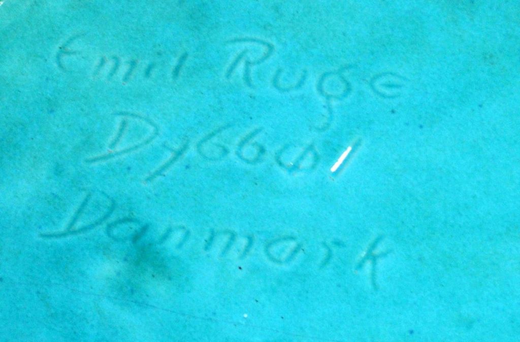 Ruge, Emil (1892 - 1977) Danmark: Fad med Aabenraa Købstads Segl. Grønglaseret lertøj. Signeret.: Emil Ruge, Dybbøl, Danmark. Dia.: 38 cm.