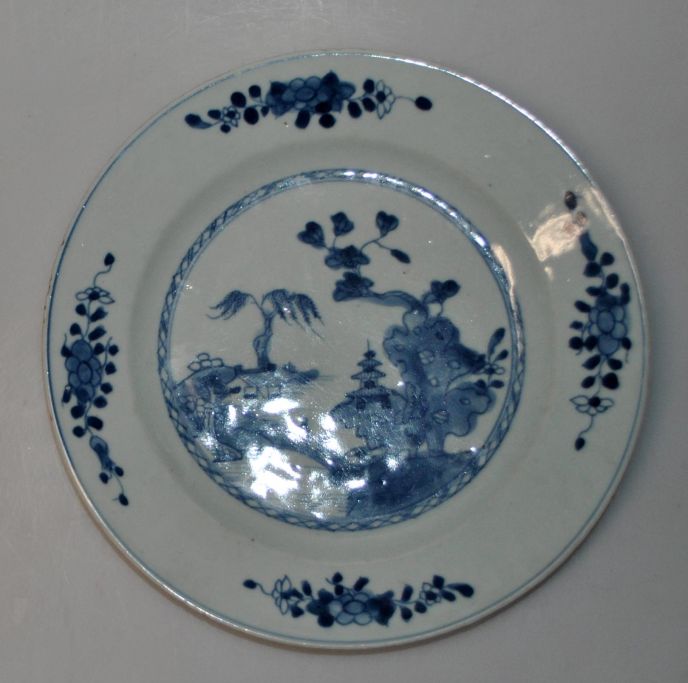 Blå/hvid tallerken, 18. årh. Kina. Porcelæn. Dekoreret med landskab. Dia.: 23,5 cm.