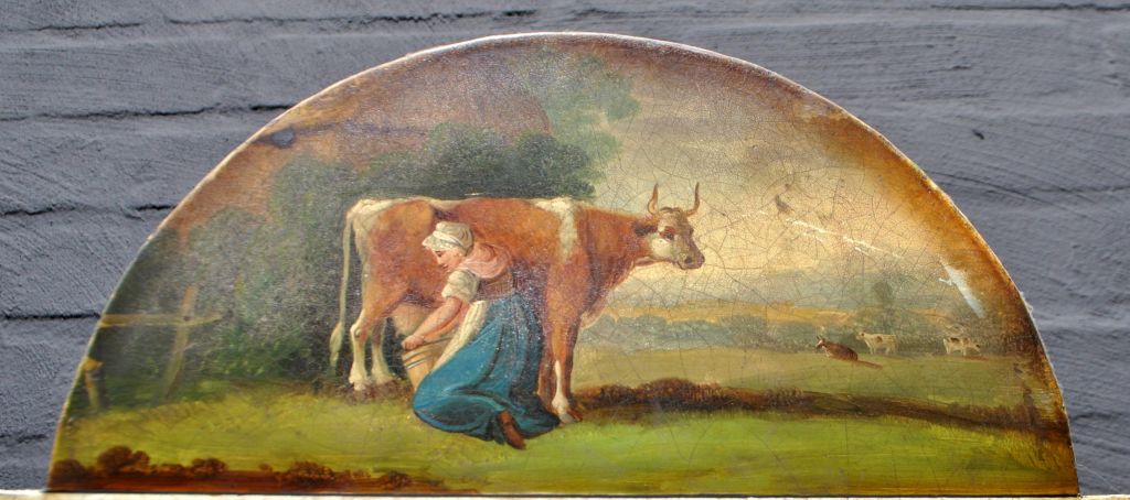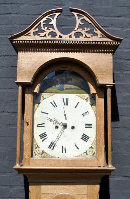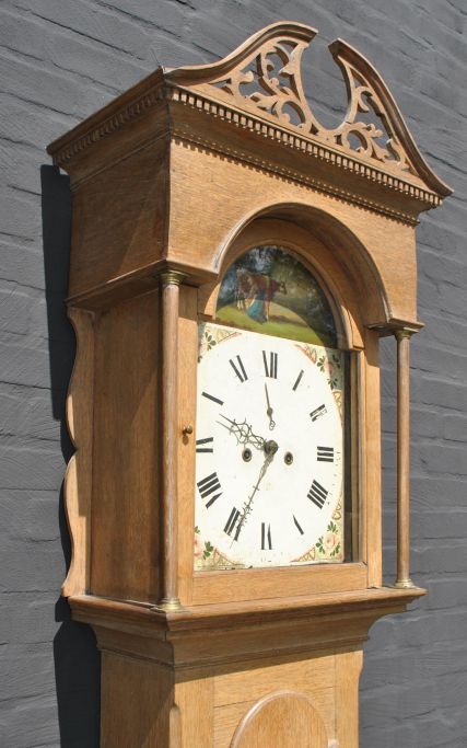 Engelsk standur i eg, ca. 1800. Med 8 døgns værk. Med svanetop og helsøjler. Bemalet skive med kvinde, der malker. H.: 230 cm. B.: 48 cm. D.: 25 cm.