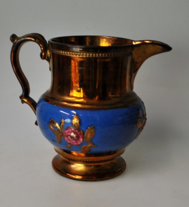 Engelsk lustra kande, 19. årh. Dekoreret med rose. Med blåt bånd. H.: 14,5 cm.