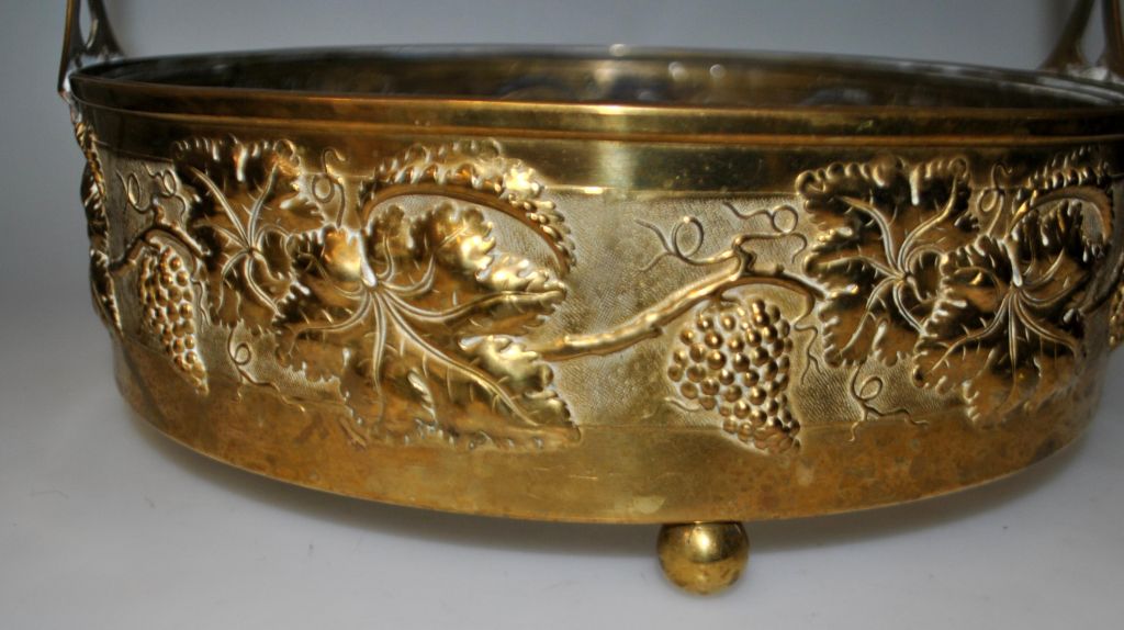 Messing frugtskål med glasindsats, WMF, ca. 1900, Tyskland. Med hank. Siderne dekoreret med vinløv. På fire kugleben. Glasindsats i klart glas med rundet bund. H.: 7,5 cm. Dia.: 23,5 cm. Højde med hank: 24 cm.