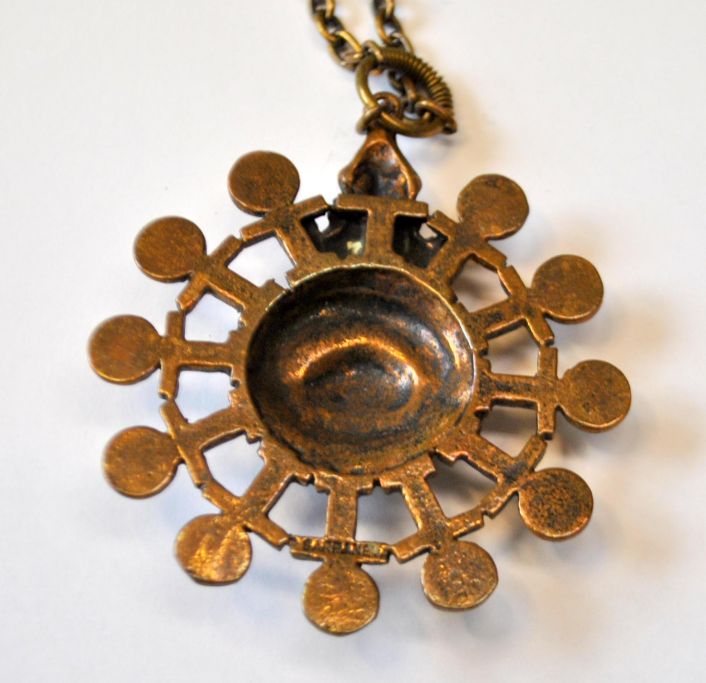 Finsk bronze halsmykke med kæde, 20. årh. Design: Pentti Sarpaneva (1925 - 1978) Finland. Smykket er udført af Turun Hopea for Kalevala Koru i 1970. Dia: 5 x 5 cm. Stemplet. Kædelængde: 66 cm.