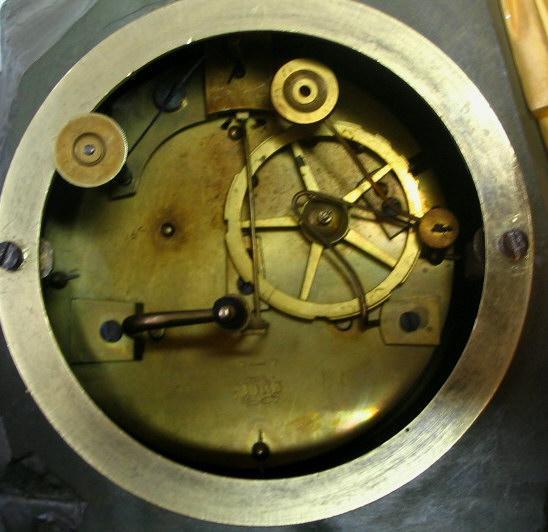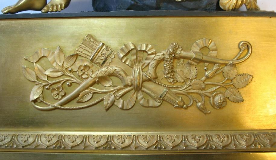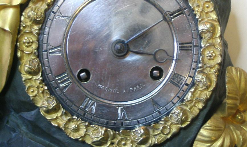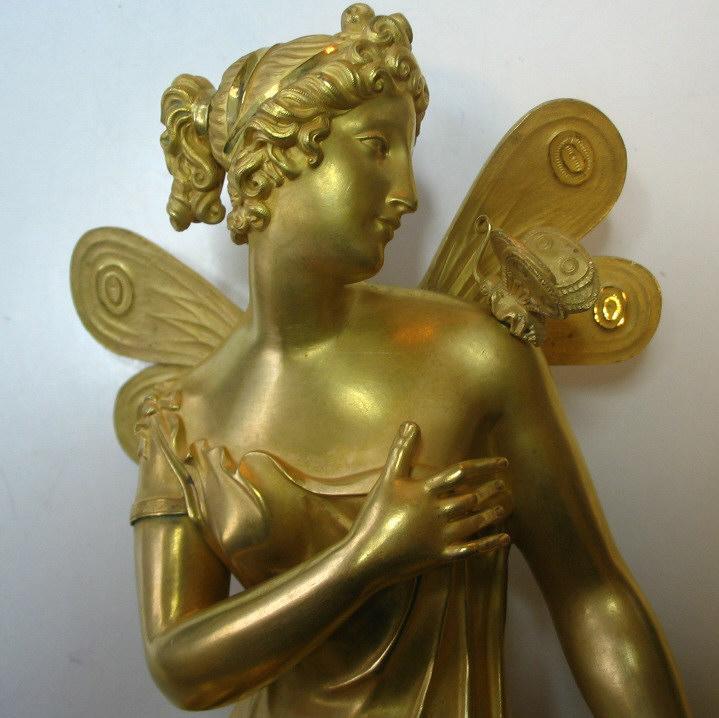Empire konsolur, Frankrig, ca.1800. I lueforgyldt bronze med sølv skive med romertal. Sign.: Maisons a Paris. Med figur af kvinde i klassisk dragt, med vinger siddende på en klippe i patineret bronze med blomster. På skulderen sidder en sommerfugl. Kassen dekoreret med akantusblade og ornamentik i form af bue, pilekogger, sløjfe og roser. H.: 47 cm. B.: 31,5 cm. Standartværk med snoreophæng, pendul og klokke. Signeret: Pon's.