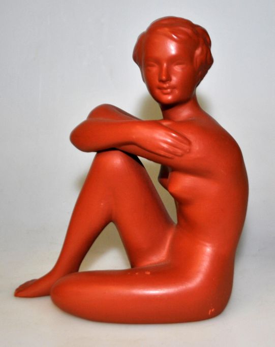 Gmunder keramik af siddende kvinde, 2026. Østrig. Stemplet. Bemalet rødler. Højde.: 12 cm.