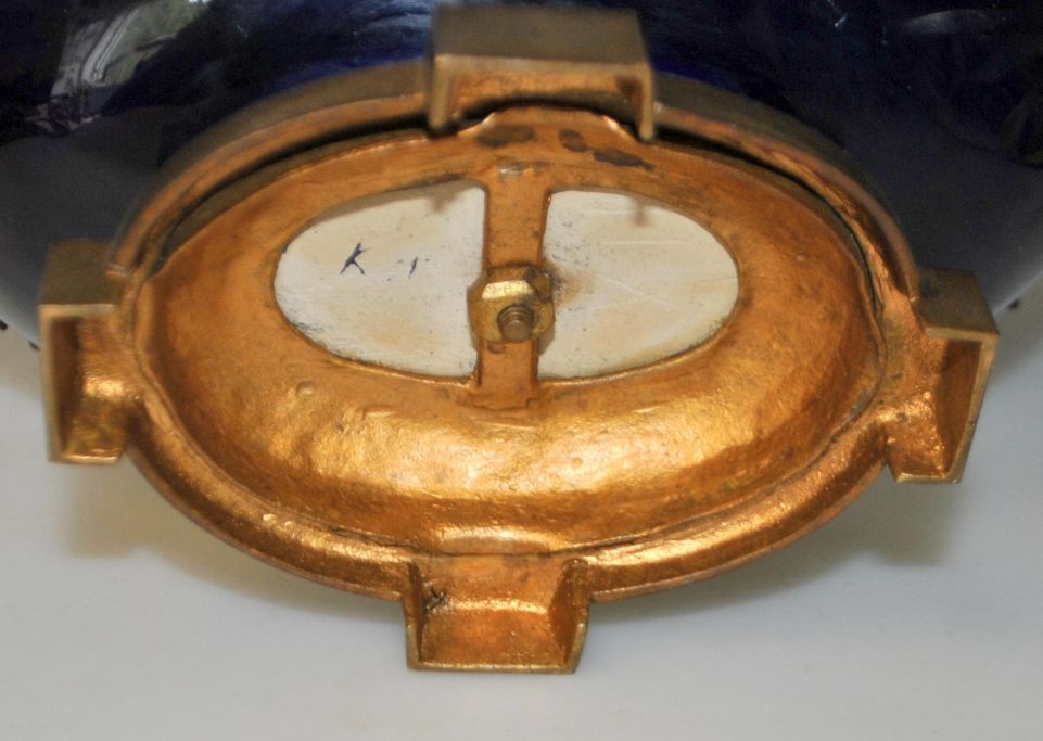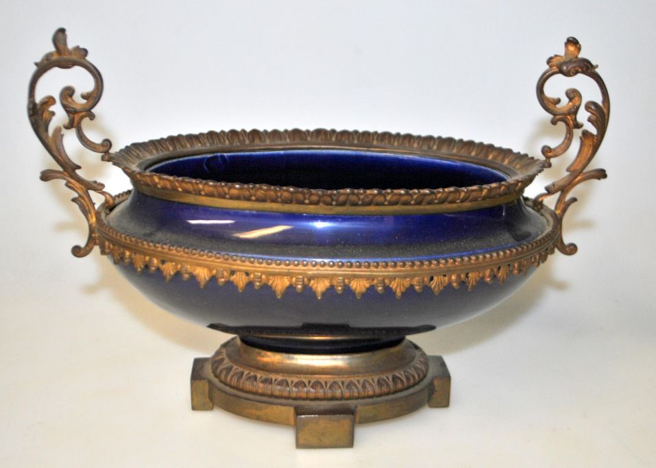 Fransk bordskål i lueforgyldt bronze, 19. årh. Sevres. Skål af fajance i coboltblåt. Signeret. L.: 24,5 cm. H.: 16,5 cm.