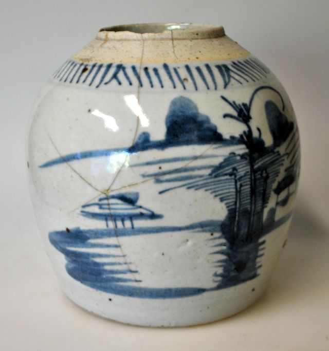 Kinesisk bojan uden låg, blå/hvid, 19. årh. Ingefærkrukke. Dekorationer i form af landskab og vand. Usigneret. H.: 15,5 cm.