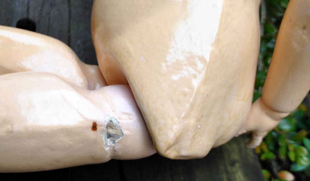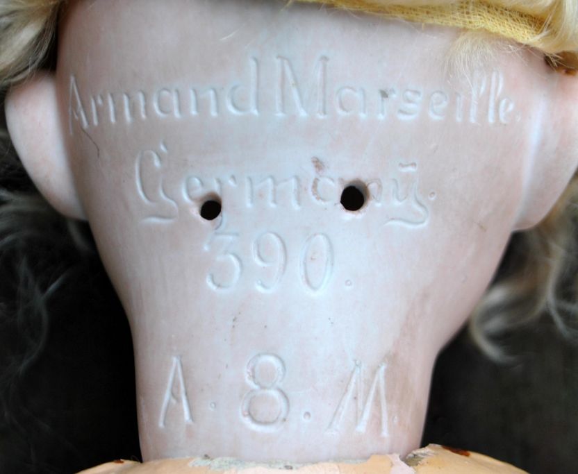Armand Marseilles dukke, 390, 19. årh. Tyskland. Bisquit hoved med lyst hår. Med krop i bemalet papmache og træ. Signeret: Armand Marseilles Germany 390. A. 8. M. H.: 63 cm.