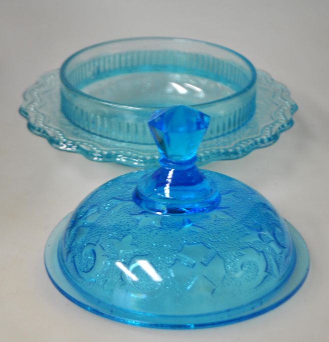Smørbeholder, ca. 1900. Blåt presset glas.