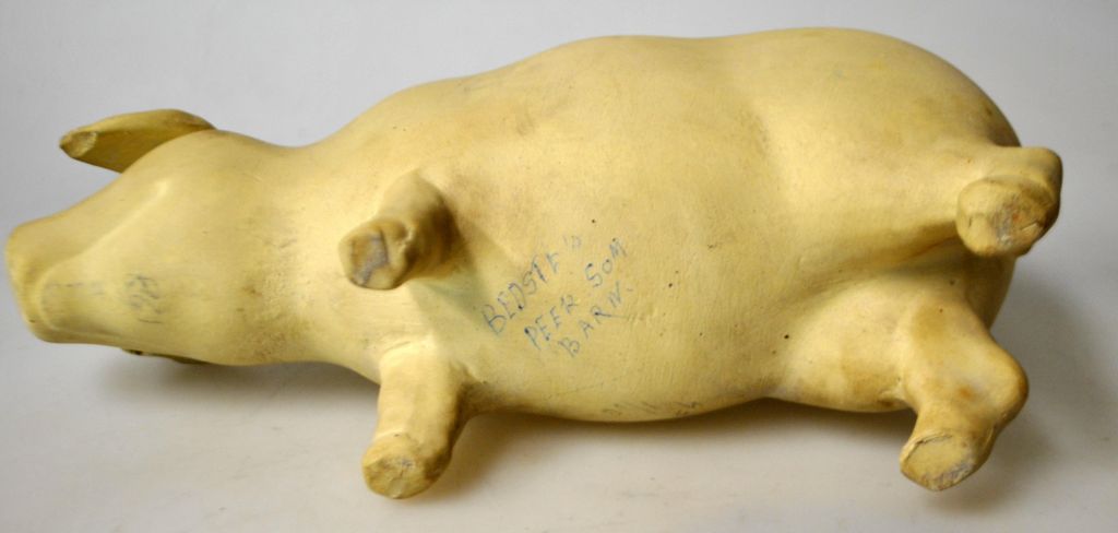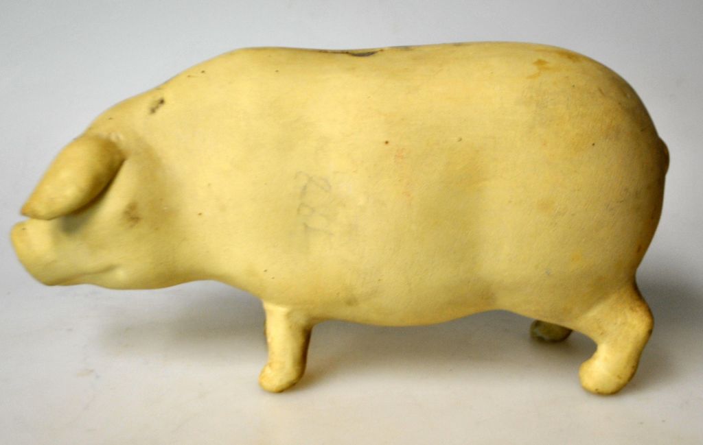 Lertøjs sparegris, 1900-tallets midte. Danmark. L: 20 cm. Mindre afslag ved møntindkast og ved ører.