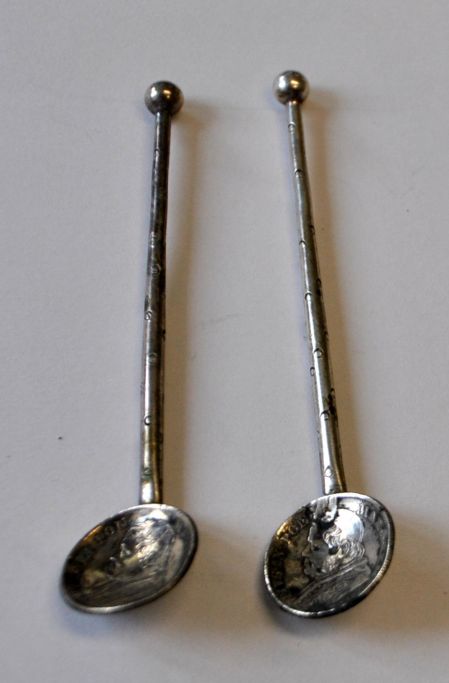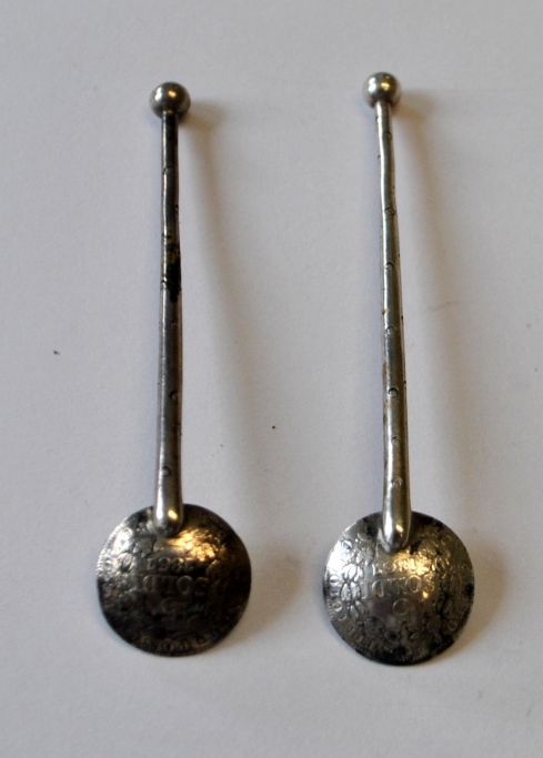 Et par antikke salt skeer i sølv. 19. årh. Italien. Laf i form af sølvmønter fra Rom med Pave Pius den IX, 5 Soldi fra 1867. L.: 7 cm.