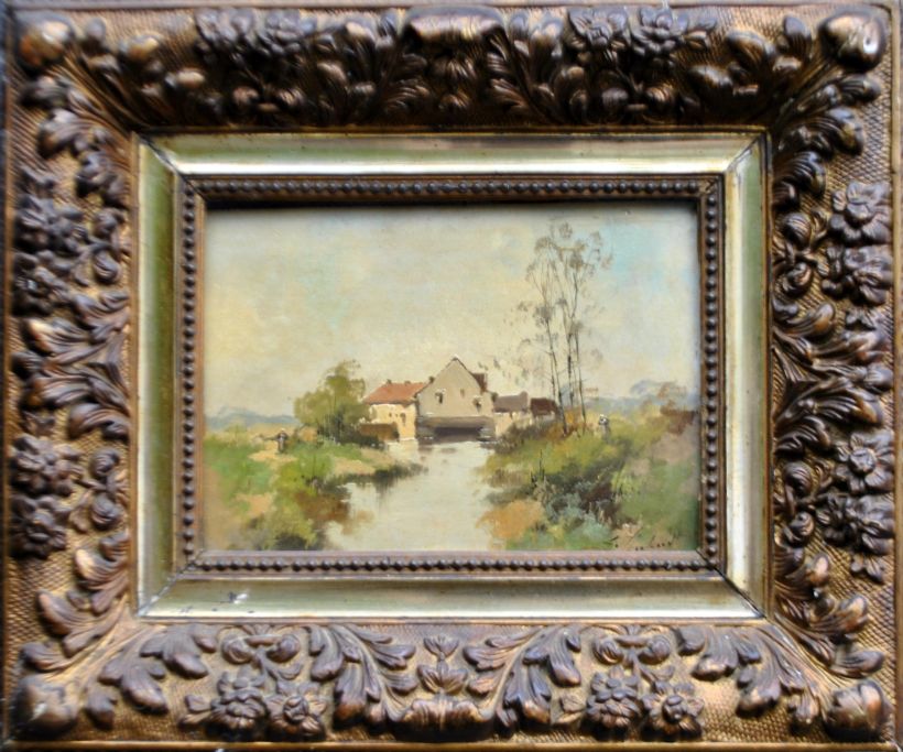 Galien - Laloue, Eugene (1854 - 1941) Frankrig: Mølle. Olie på panel. Signeret: L. Dupuy. H: 15,3 cm. B: 22 cm. Flot forgyldt ornamenteret ramme med blomster.