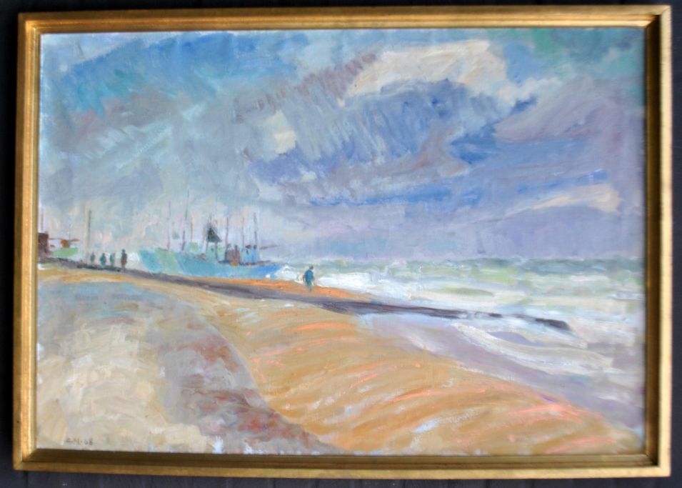 Munkholm, Alfred (1896 - 1981) Danmark: Scene fra Løkken med optrukne fiskerbåde. Olie på lærred. Signeret 1968. 70 x 100 cm.