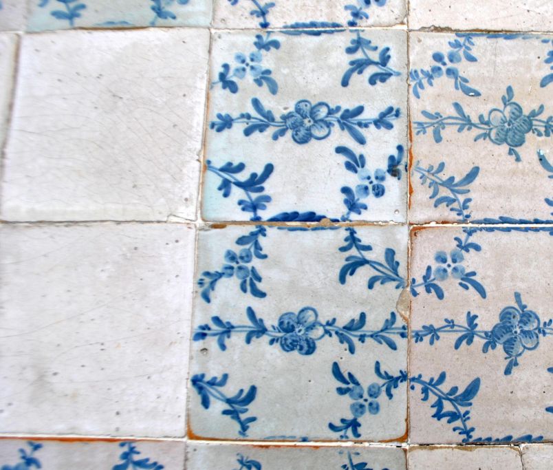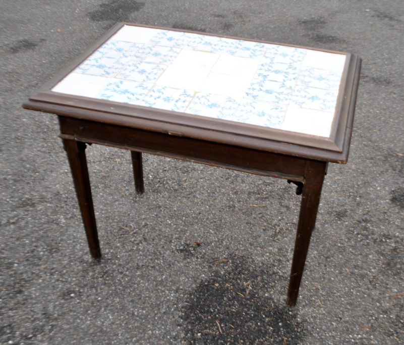 Sjældent originalt brun bemalet flisebord, Louis XVI, 1780, Danmark. Med tilspidsede ben. Med 16 fantastisk sjældne blåmalede ornament fliser med blomster og ranker fra Morsø Fabrikken i mønster. Herudover 8 helt hvide fliser fra samme periode - antagelig fra - København. Det hvide fliser sidder som et firpas i midten og en i hvert hjørne. H.: 70 cm. L.: 89 cm. D.: 62 cm.