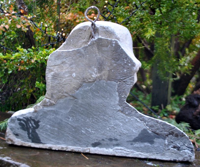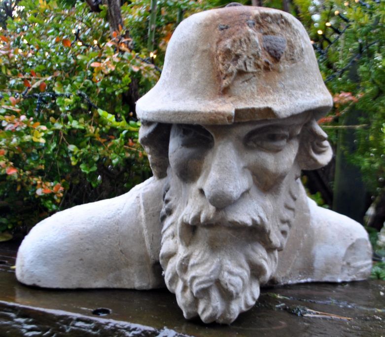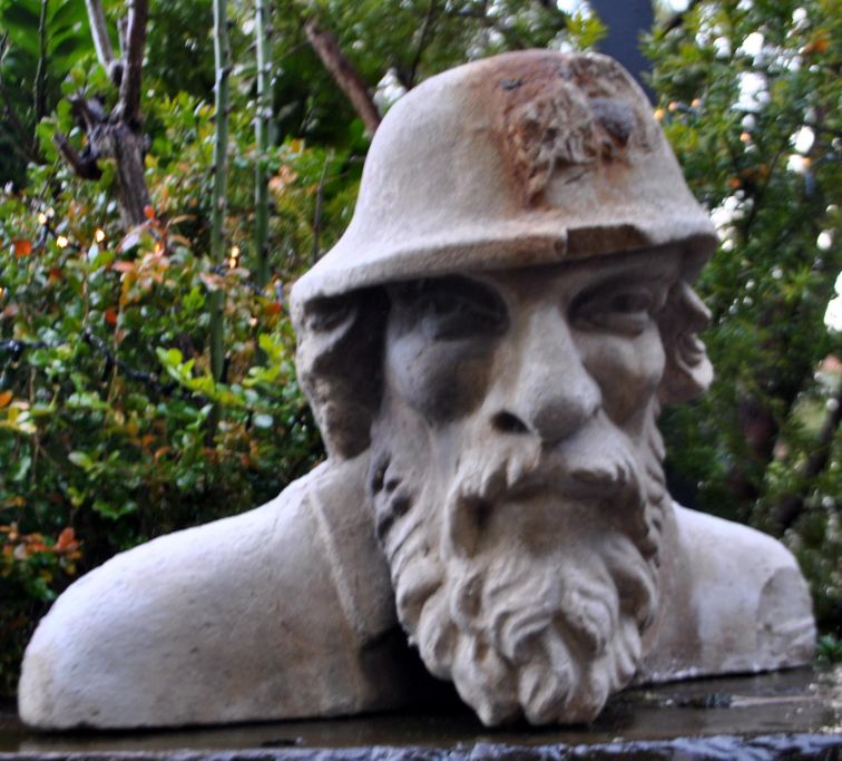 Herre buste af mand med hat, 19. årh. Sandsten og skiffer. 30 x 42 cm.