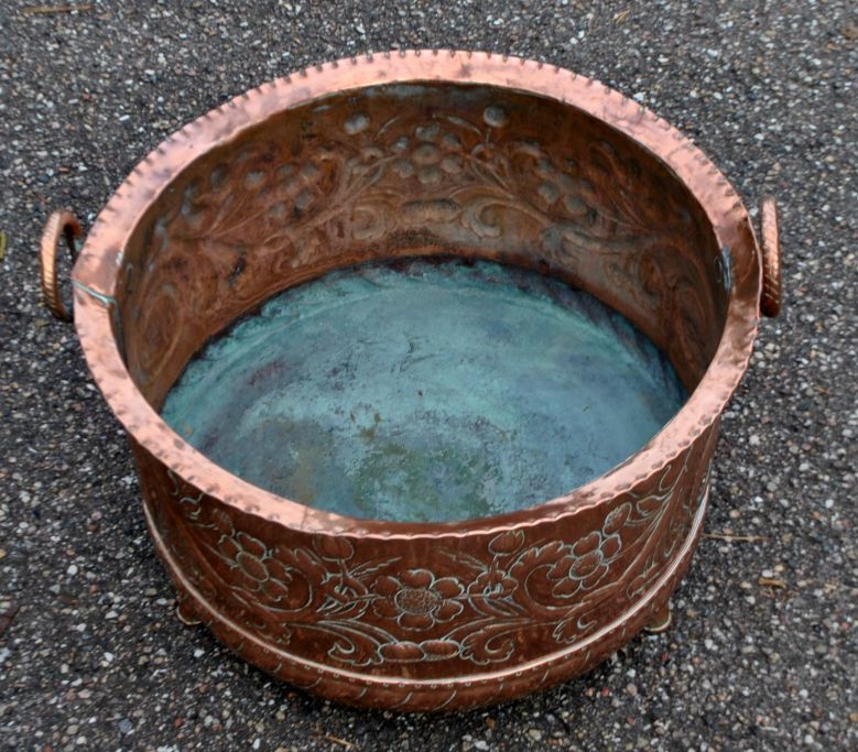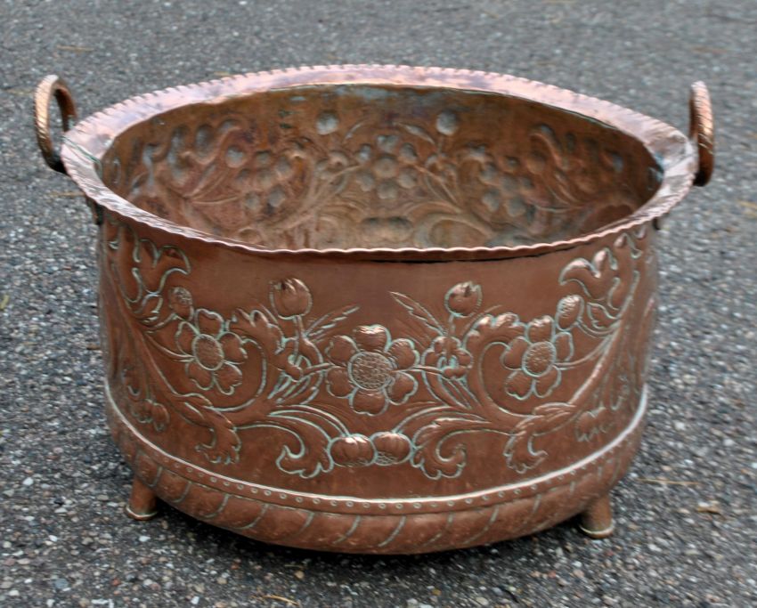 Brændespand, Haraldskjær Kobber Fabrik, Vejle, 19. årh. Danmark. Med tre ben og to hanke. Med tarige bankede dekorationer på siden. H.: 29 cm. Dia.: 40 cm.