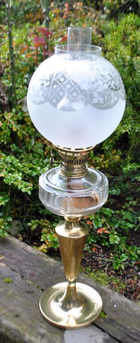 Petroleums lampe, ca. 1880. Messing fod, klar glas beholder med slibninger og øverst kuppel i matteret glas med dekorationer. Højde med brænder.: 63 cm.