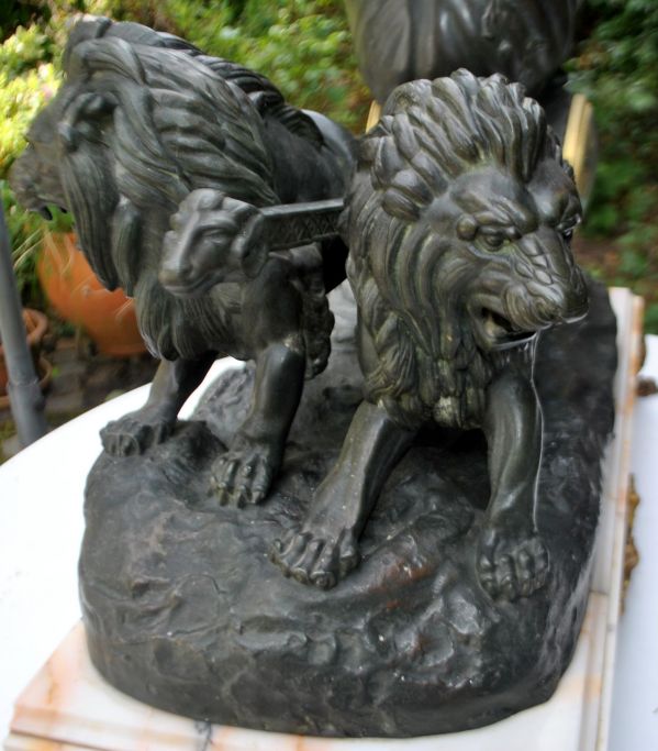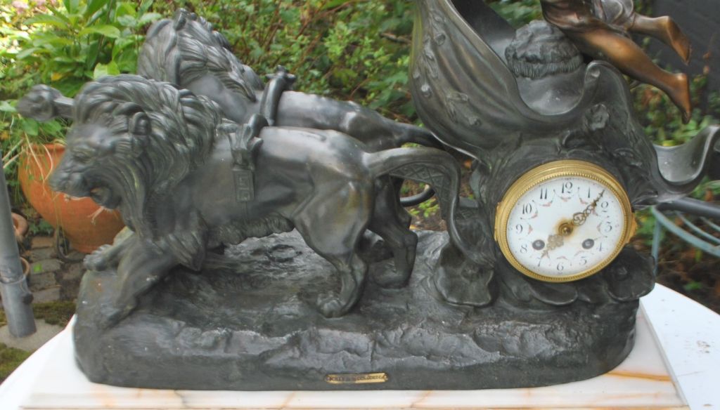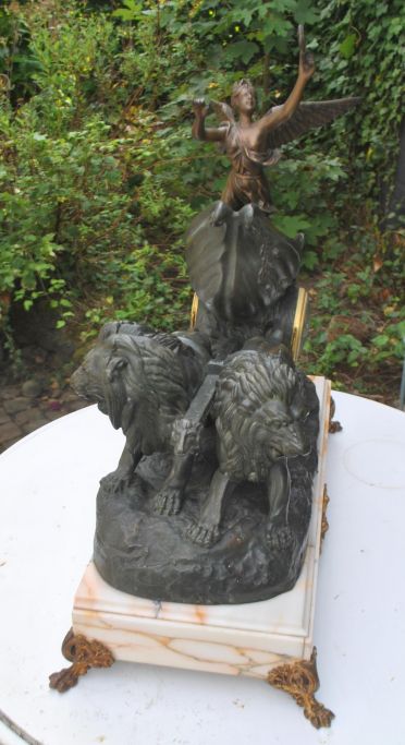 Kæmpe fransk kaminur, 19. årh. Char de la Concorde. Nike - gudinde personificeret som sejren. Zinkur på marmorbase. Nike på stridsvogn trukket af løver. Figurerne er bronzeret.