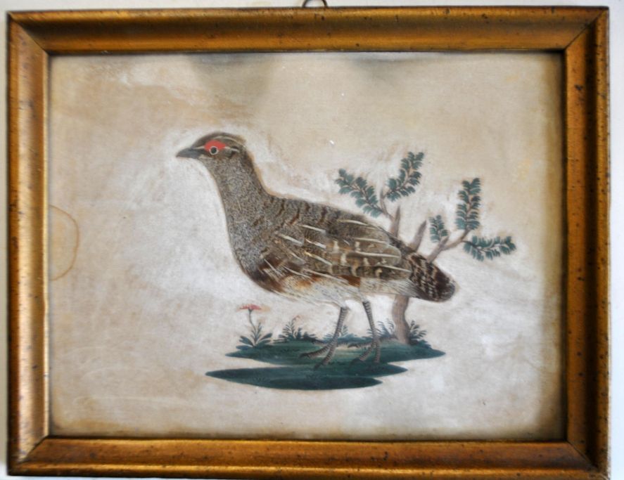 Kiebitz, Wilhelm (1847 - 1869) Danmark: En agerhøne. Fjerbillede på papir. Med akvarel. 13,5 x 18,5 cm.