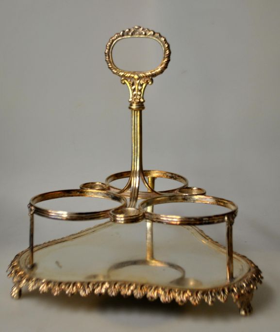 Engelsk forsølvet vinholder, 20. årh. Trekantet form til tre flasker med holder. H.. 26 cm. B.: 25 cm.