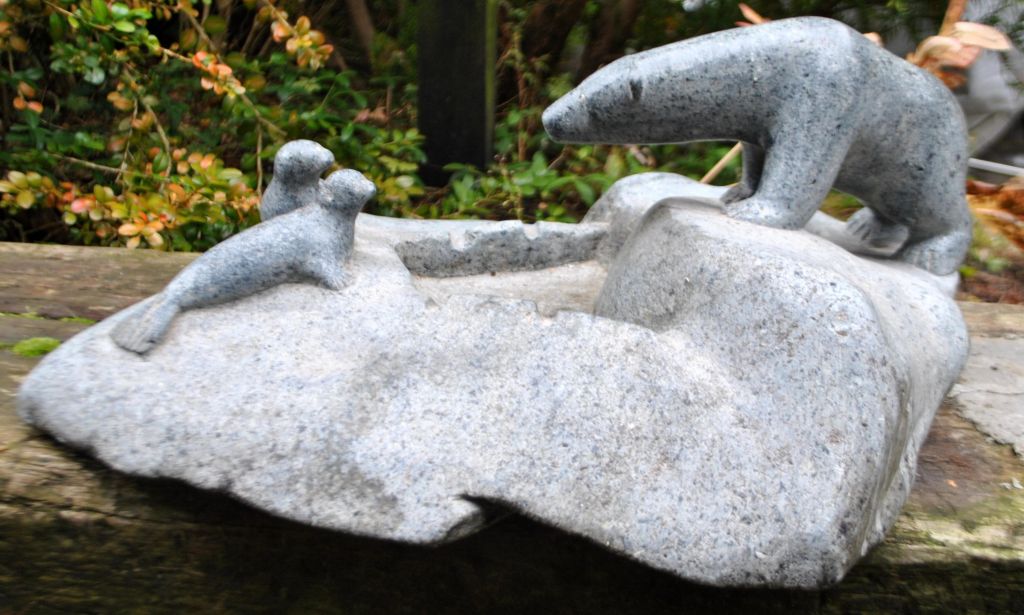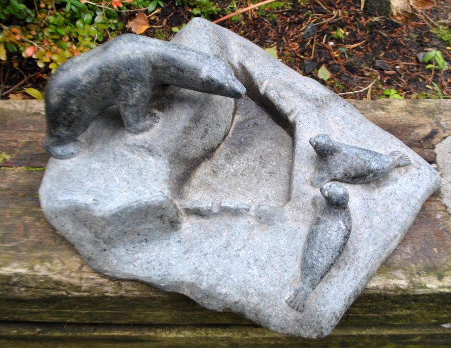 Kæmpe Grønlandsk fedtstensfigur, 20. årh. En isbjørn jagter to sæler. Usigneret. L.: 48 cm. B.: 36 cm. H.: 20 cm.
