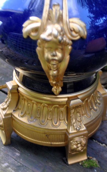 Fransk bordlampe, 19. årh. Tidligere petroleumslampe, omgjort til el. Forgyldt bronze og korpus i blåt porcelæn. Med smukke dekorationer af engle. H.: 65 cm.