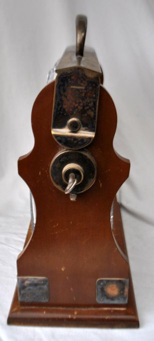 Engelsk tantalus med to krystal karafler, 19. årh. Med metalbeslag og lås med nøgle. Stemplet. H: 32 cm. L: 27 cm.