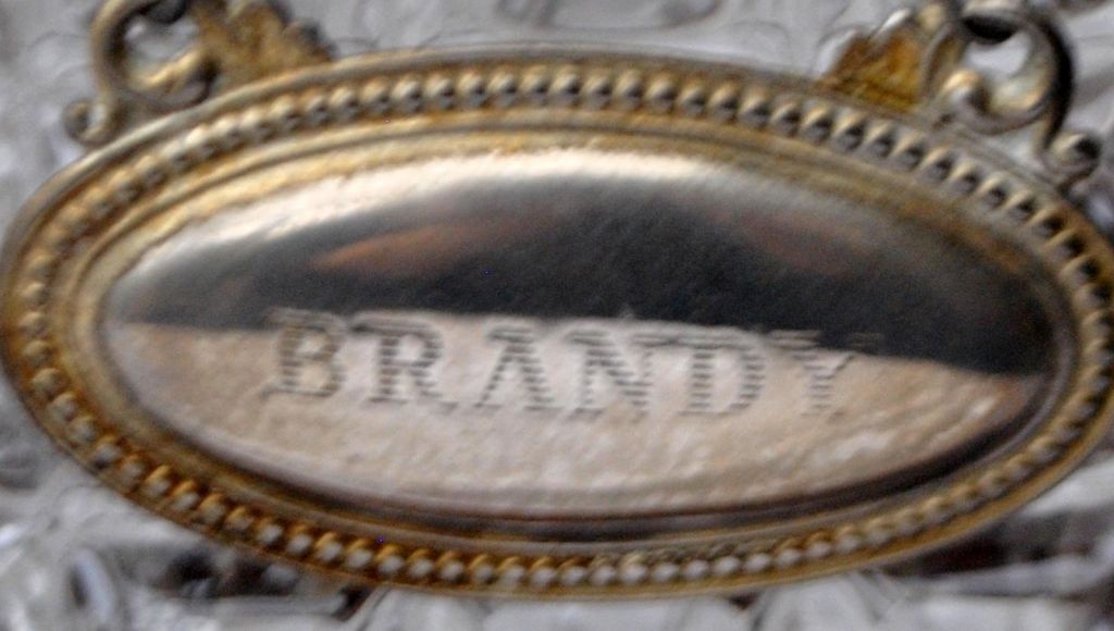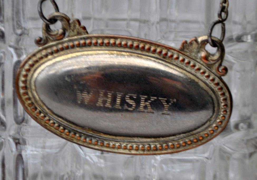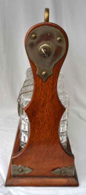 Engelsk tantalus med tre krystal karafler, 19. årh. Poleret egetræ. Med messingbeslag og lås med nøgle. Karafler forsynede med forsølvede skilte for brandy, sherry og whisky. H: 31 cm. L: 35 cm.