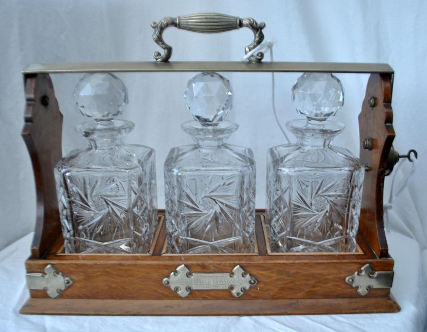 Engelsk tantalus med tre karafler, 19. årh. Poleret egetræ. Med forsølvede beslag og lås med nøgle. H: 32 cm. L: 41 cm.