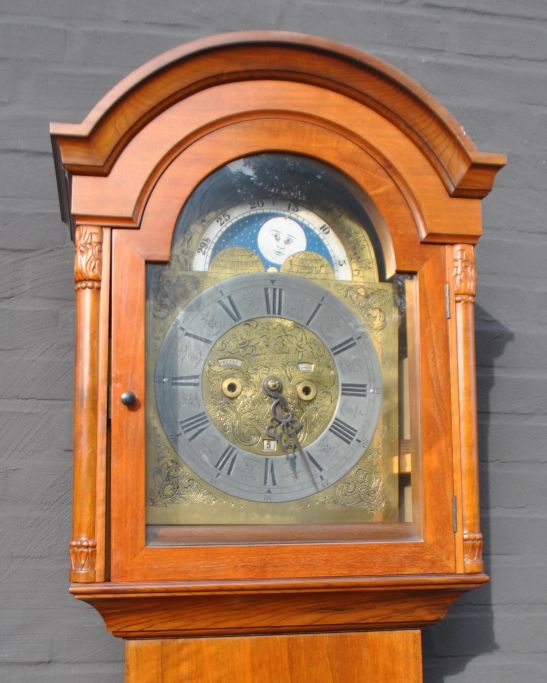 Dansk standur, 20. årh. Urfabrikant og urmager Anker Luplau Dinesen, Randers. No.: 325. Standur i mahogni med urhus med kvartsøjler. Urværk med månefase og kalender med måneder og dato. Med timeviser. Skiv i messing med romertal. H.: 210 cm. B.: 44 cm. D.: 24 cm.