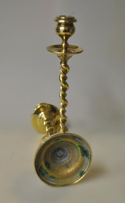 Par danske antikke messingstager, 19. årh. Med snoet stamme. H.: 19 cm.