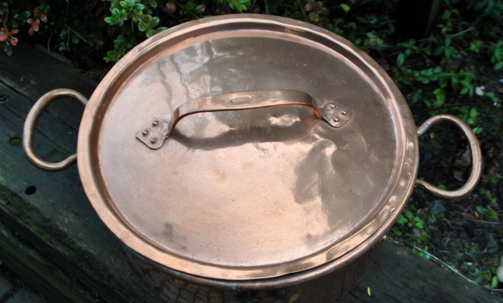 Stor antik kobbergryde med håndtag og låg, 19. årh.