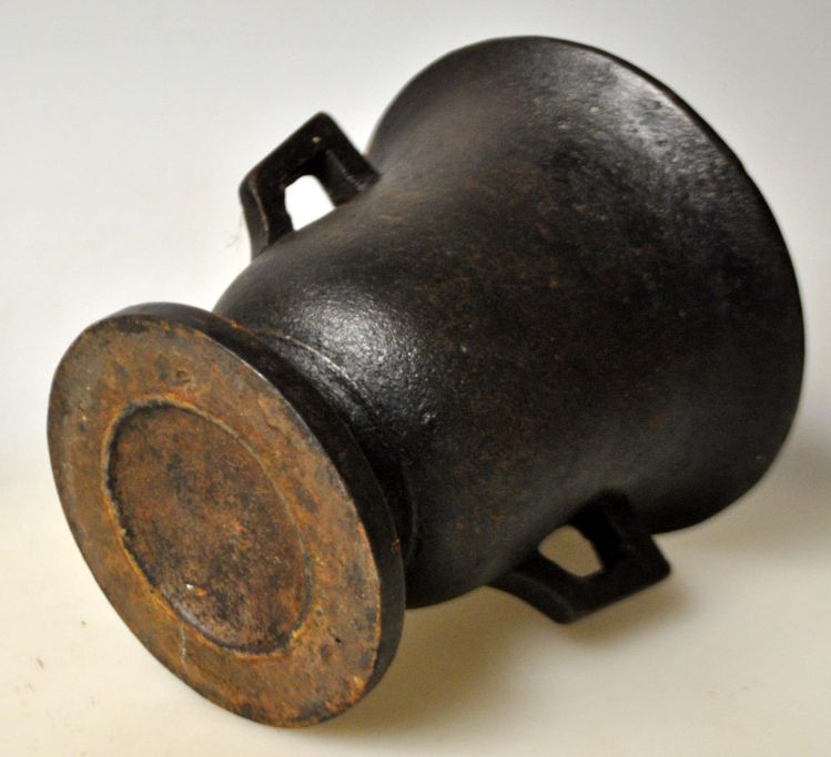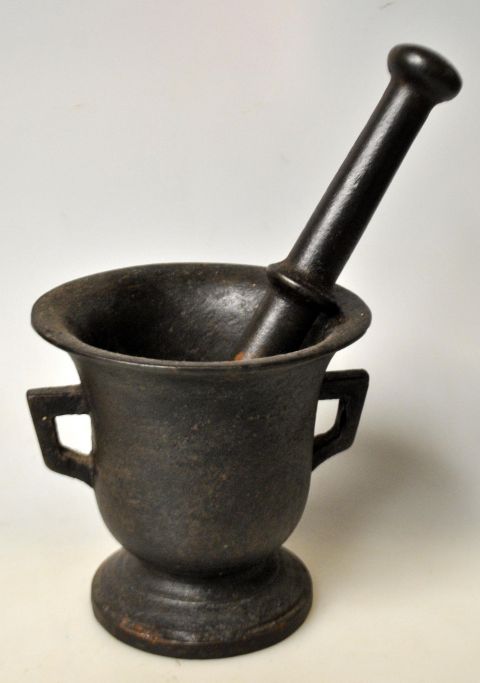 Støbejern morter, 19. årh. Støder længde: 19 cm. Morter H: 11,5 cm. Dia: 11,5 cm.