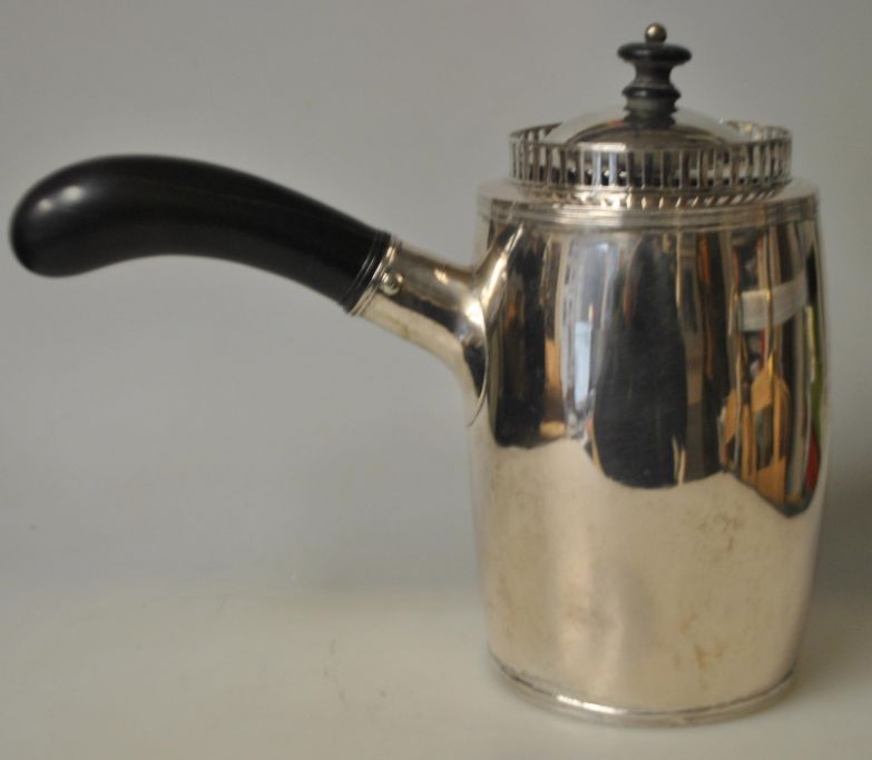 Martin Hinrich Petersen (1756 - 1824) Haderslev, Danmark: Stjert empire kaffekande i sølv. Glat korpus. Håndtag og knop i ibenholt træ. Mesterstemplet og bymærke. På side kartusche: A.W. H.: 21 cm. Vægt: 579 gram.