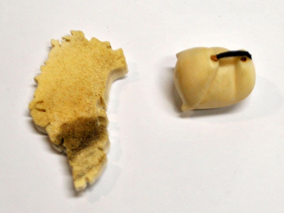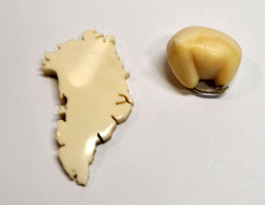 Lot Grønlandica, 20. årh. Bestående af kæde, vedhæng med Grønland i ben og blære i tand. Kædelængde: 46 cm. Grøndland: 6 cm. Blære: 3 cm.