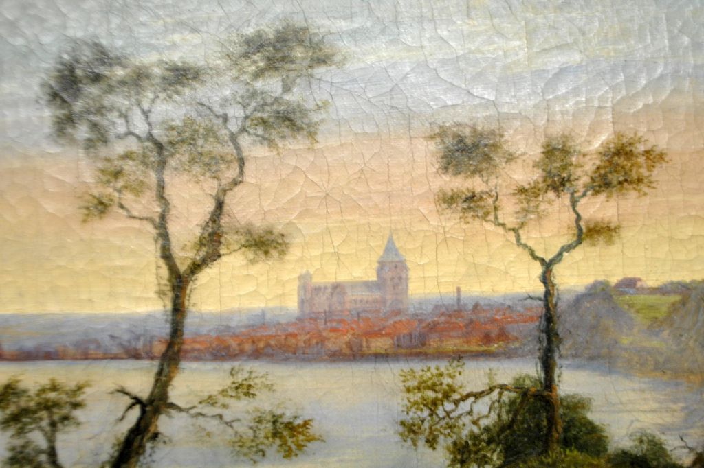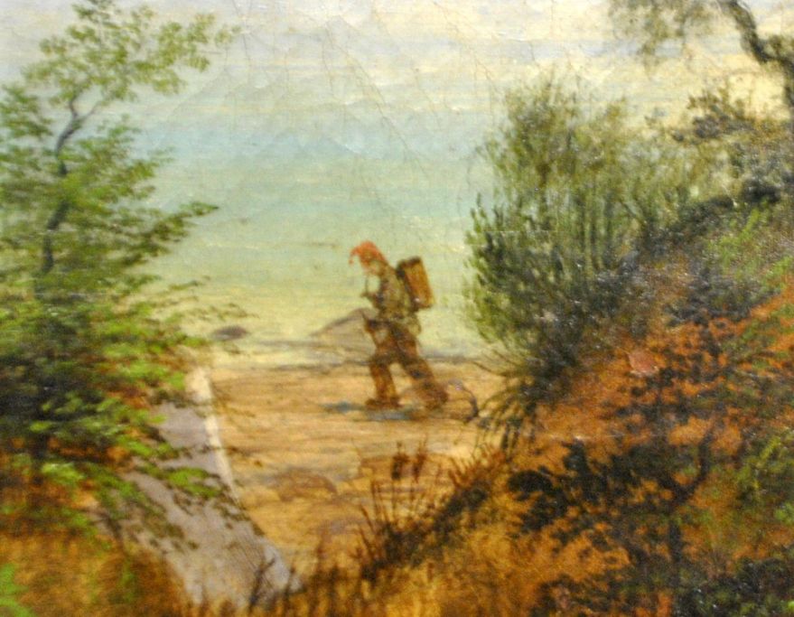 Holm, Peter (1798 - 1875) Danmark: Udsigt over Aarhus bugten mod Aarhus med Domkirken. Udsigt fra Risskov. I forgrunden ses en vandrer. Usigneret. 40 x 55 cm.