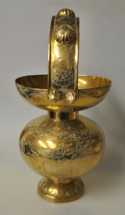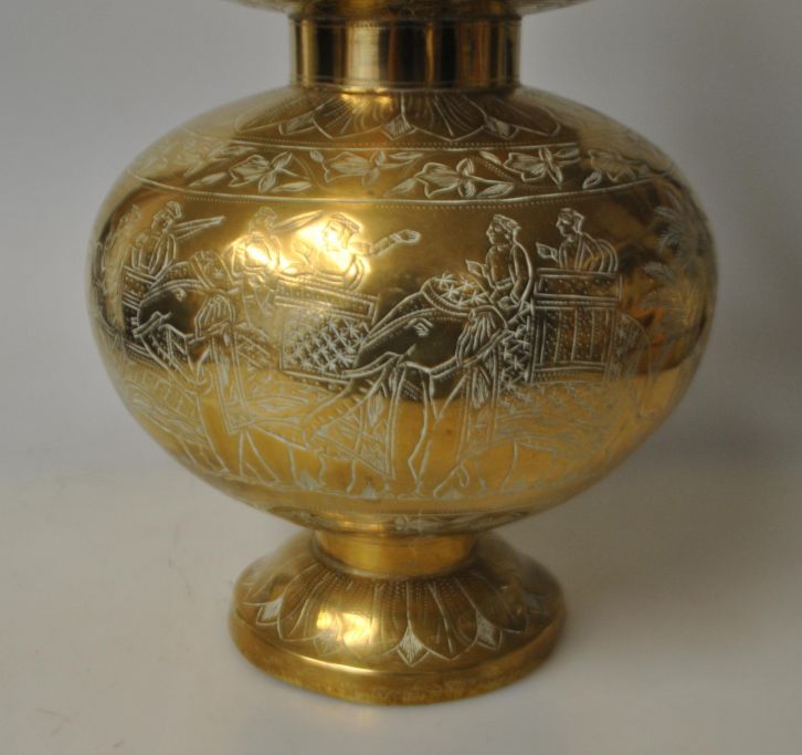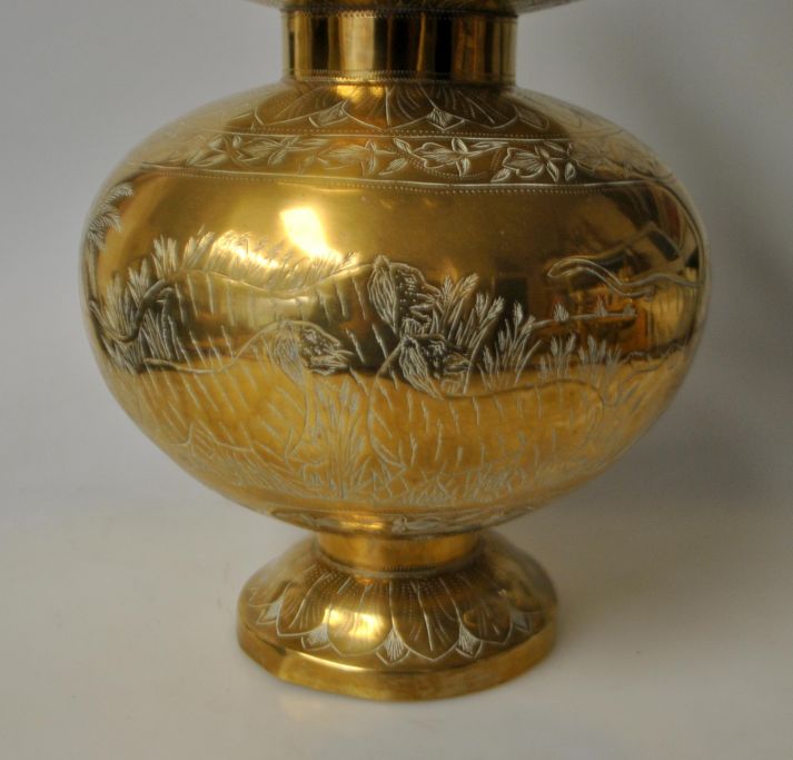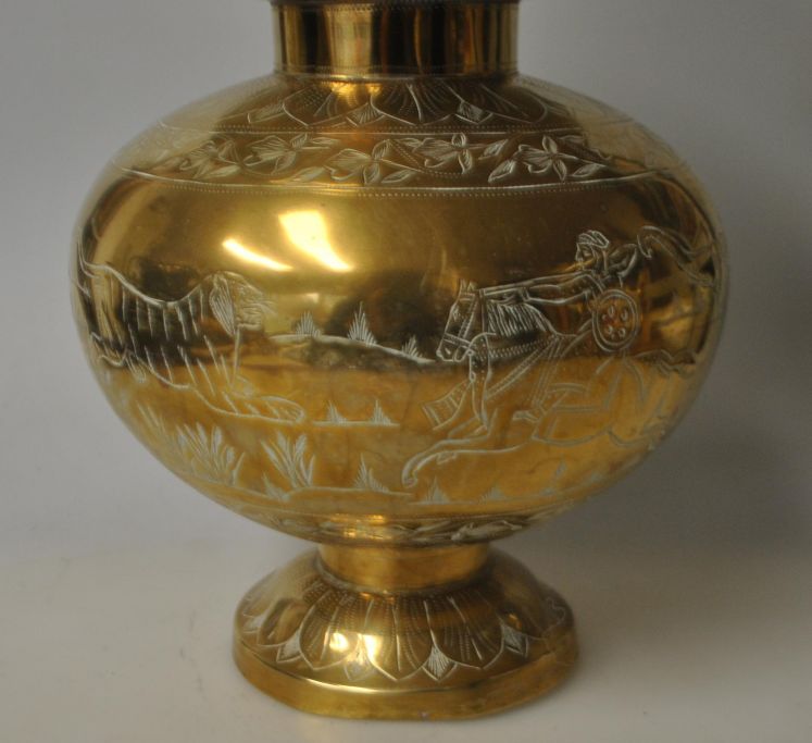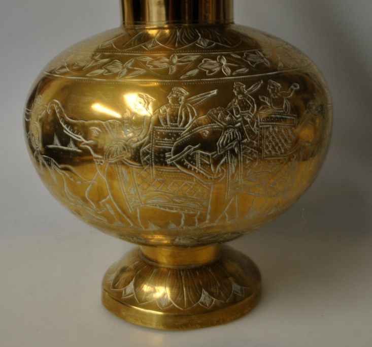 Stor indisk messing vase med hank, ca. 1950. Med indgraverede dekorationer af jagtselskab på elefanter på tiger jagt. På siden ses 4 tigre. Desuden indgraverede blomstermotiver. 32 cm. H.: 21 cm.