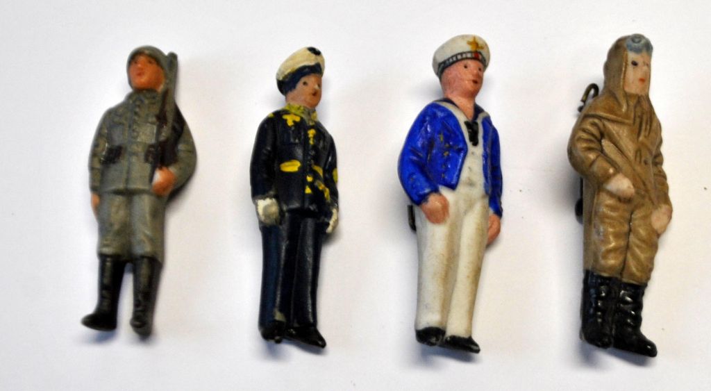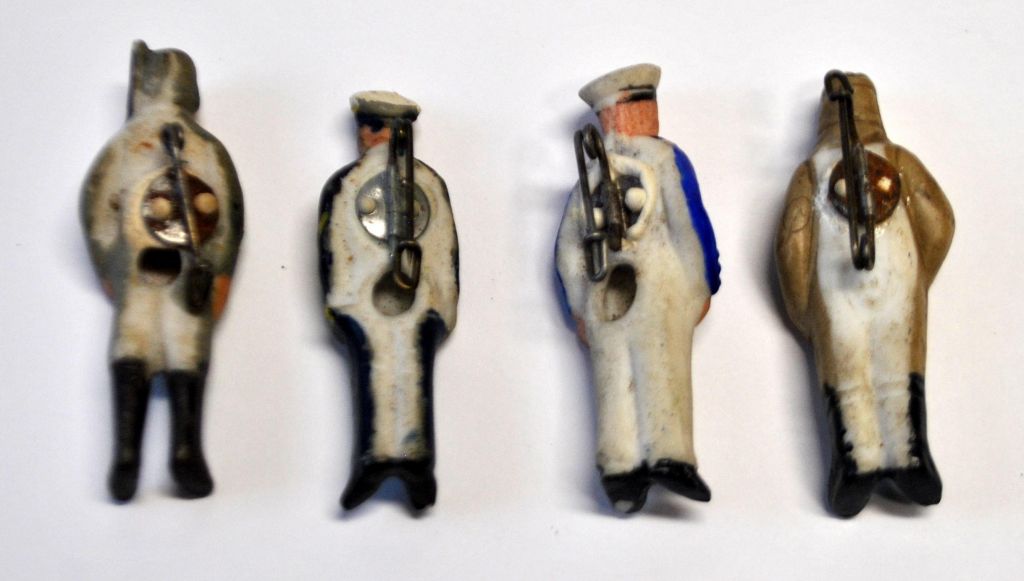 Samling tyske bisquit håndbemalede militære brosche figurer, ca. 1933. Figurer forestillede: En soldat, flyver, matros og kaptajn i søværnet. H.: 4,5 cm.