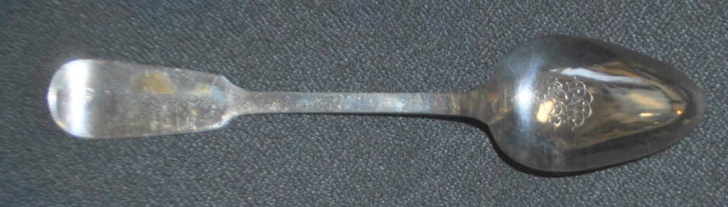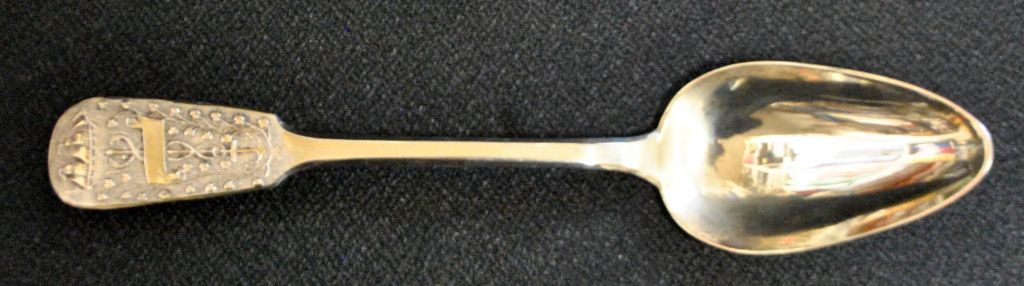 Skipperske sølv. 1975. Pärnus, Estland. Fra firmaet Jacob Jacke & Co. Givet som gave til skipper J. R. Eriksen. Navn indgraveret. Ske dekoreret med bl.a. anker og sejlskib. Ukendt sølvmester. L.: 21 cm. Med gravering på laf.