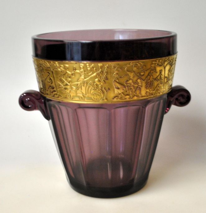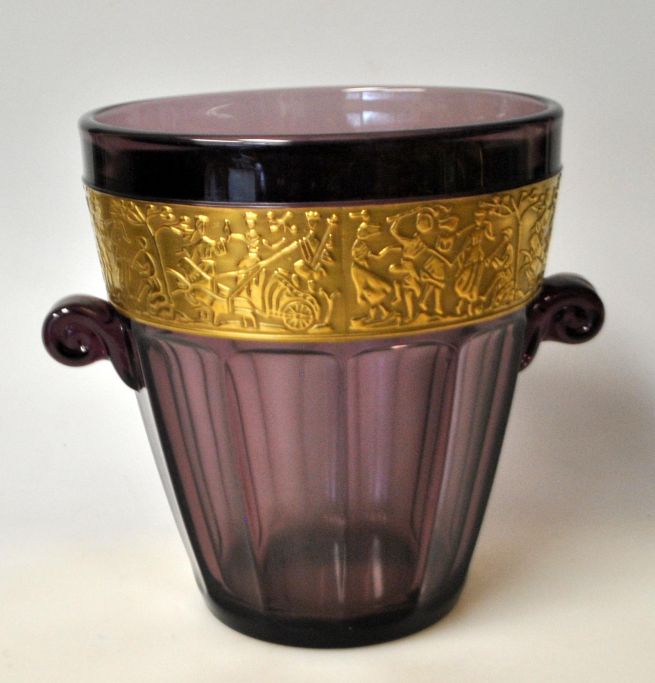Moser, Ludvig & Söhne, Karlsbad, 1920'erne: Et par isspande. I violet glas med ætset guldfrise med motiv, på tysk kaldet "Krieger". H.: 14 cm.