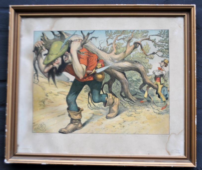 Moe, Louis (1877 - 1945) Danmark: Kompostion med mand, der bærer et træ. Farvelitografi. Signeret i trykket. Udgivet af Alfred Jacobsen, København. 27,5 x 36 cm.