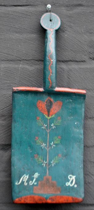 Bankebræt, Danmark, 19. årh. I bøg med bemaling i blåt med blomster. Med initialer: A. J. D. Opmalet. L: 45 cm. B: 17 cm.