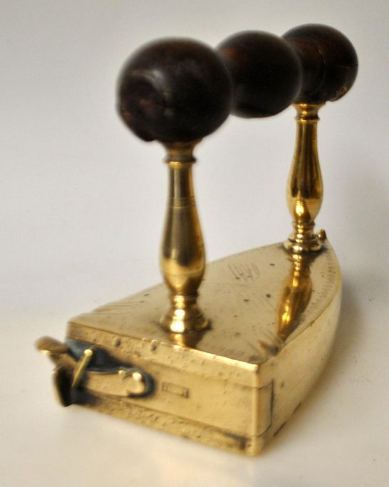 Messing strygejern, 19. årh. Danmark. Stemplet. Med graveringer. Med træhåndtag. L.: 14 cm. H.: 12,5 cm.