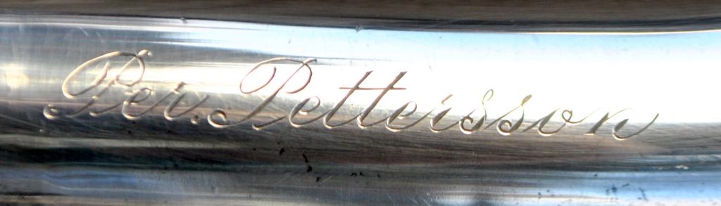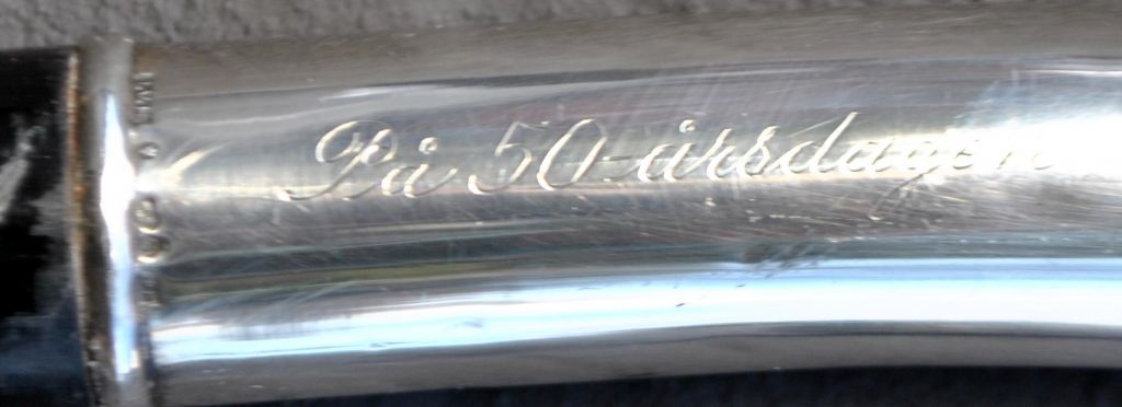 Stok i ibenholt med sølvhåndtag, Sverige, 1947. Stemplet: GVH. Indgraveret: Per Pettersson og på 50-årsdagen. L: 90,5 cm.