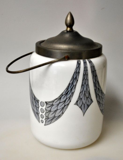 Bisquitdåse, Fyns Glasværk, opalhvid glas med påbrændt dekoration, 1910. Nr. 2287/429. Dekoration med kontur som overføringsbillede. Med metalbeslag i forsølvet nikkel med hank og låg. H. inkl. låg: 21 cm. Dia: 12,5 cm. Den afbildede ikke nummereret.