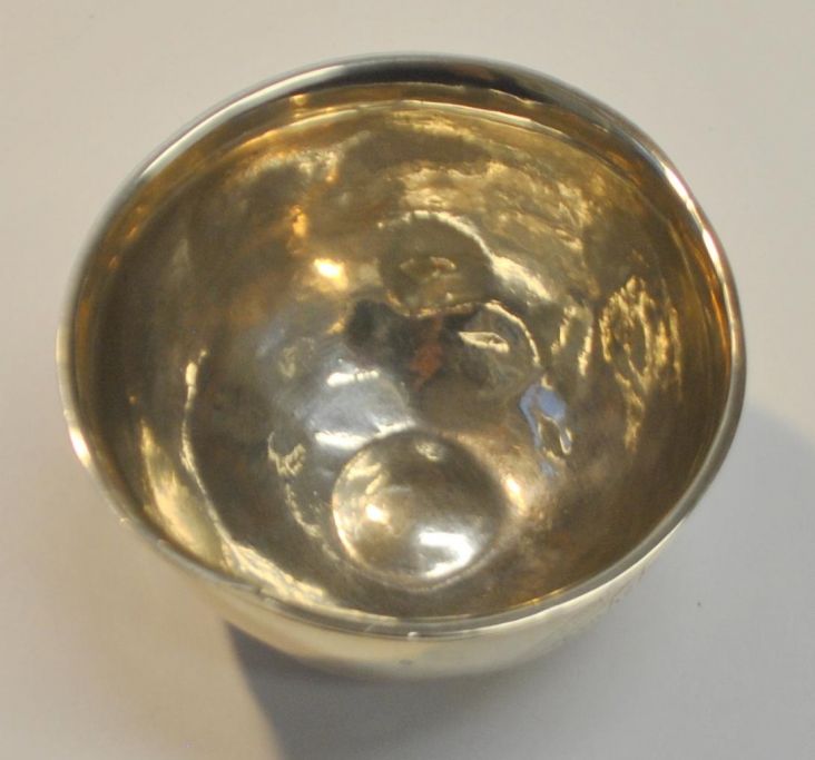 Peter Christensen Aschberg Kraft (1704 - 1753) Faabrog, Danmark: Sølv tumling 1739. Brahetrolleborg, Fyn. På side kartusche: Brahetrolborg 1739. Med jæger, der skyder til måls med et gevær mod en skive. Ligeledes monogram. Mesterstemplet. H.: 4,2 cm. Dia.: 6,5 cm.