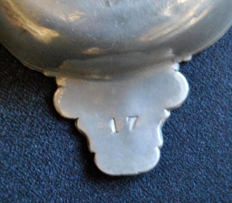 Barok øre skål i tin. 18. årh. Danmark. Madskål. Med glatte, buede sider. Støvte ører med barokmønstre. På undersiden af det ene øre, stemplet: 17. Dia: 16 cm. Længde med ører: 24,5 cm. H.: 4 cm. Ingen mesterstempler.